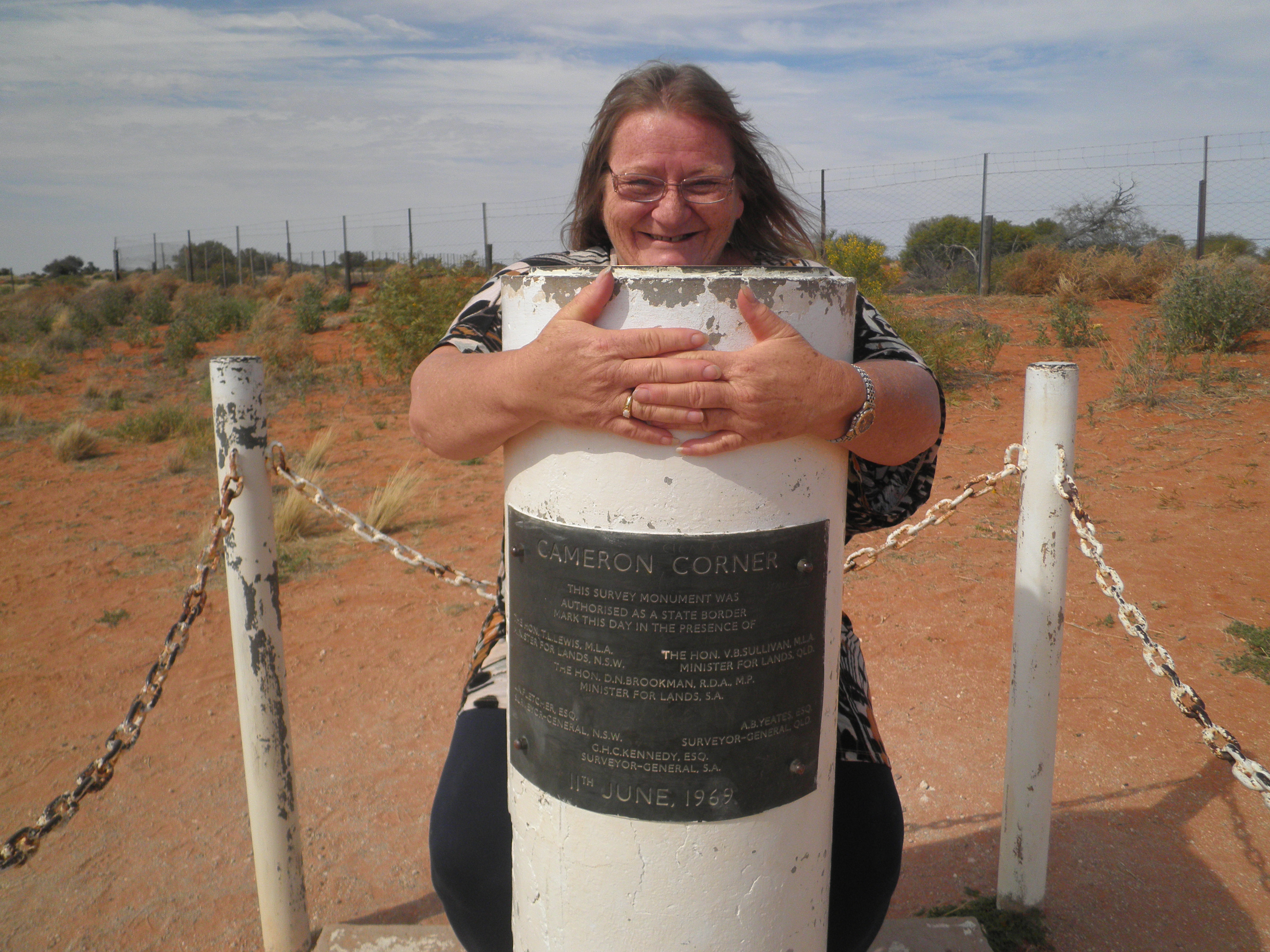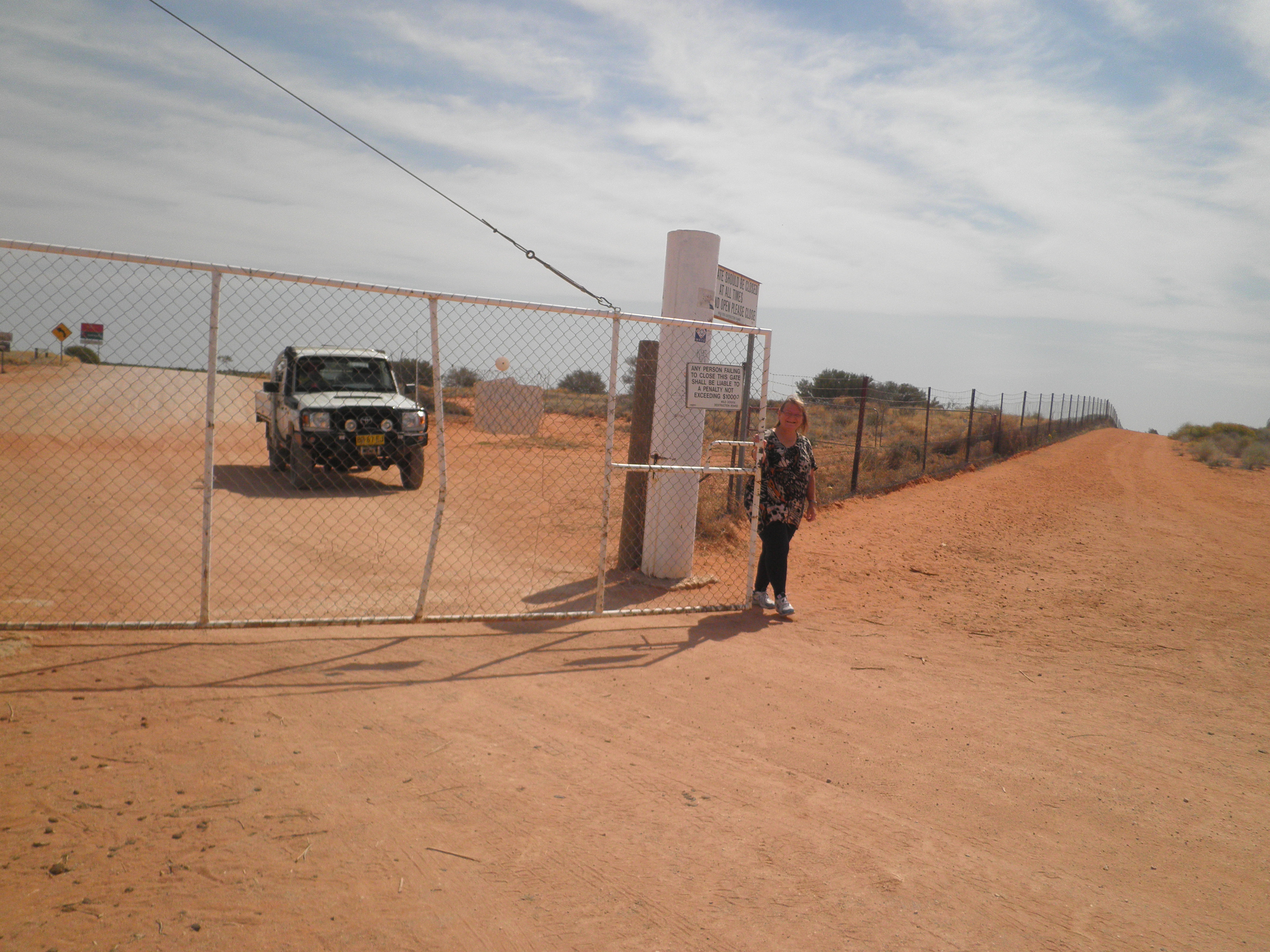 OLYMPUS DIGITAL CAMERAAnd then came Cameron Corner. A bumpy ride through a national park (mainly of course bull dust and low growing greenery with wildlife in places) as a passenger in the Outback you have a job and a title – so I got to be the ‘gate bitch’, yes that means I got out to open and close all the gates along the way. There’s not much at Cameron Corner but it is important, the dingo fence runs through there and there is an awesome pub (if you go there, take a spare cap, apparently visitors leave a cap in the pub, so there are whole walls of caps from all over the world), other than that there is the official mark where 3 States meet (and a toilet block).