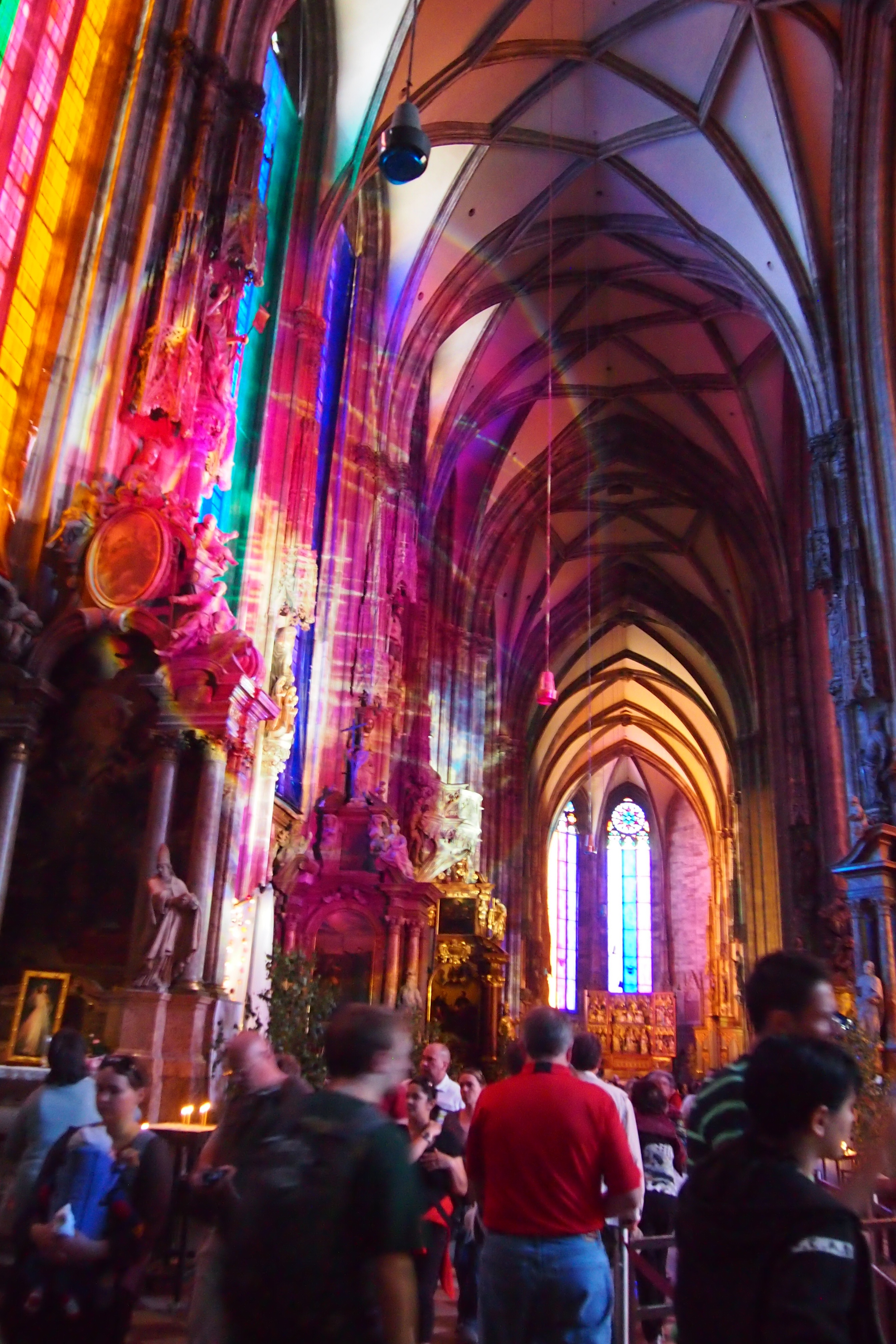 First was the statue of Field Marshal Joseph Radetzky von Radetz, yes the one in honour of whom Johann Strauss Snr wrote the Radetzky March. Then St. Stephen’s Cathedral (more commonly known by its German title Stephansdom) the church of the Roman Catholic Archdiocese of Vienna and the seat of the Archbishop of Vienna. It stands in all it’s Romanesque and Gothic glory in Stephansplatz. I believe that the funeral of the Italian composer Antonio Vivaldi was held there. Inside I was amazed to be greeted not by silence, gloom and candles but a vibrant colourful light show – amazing.