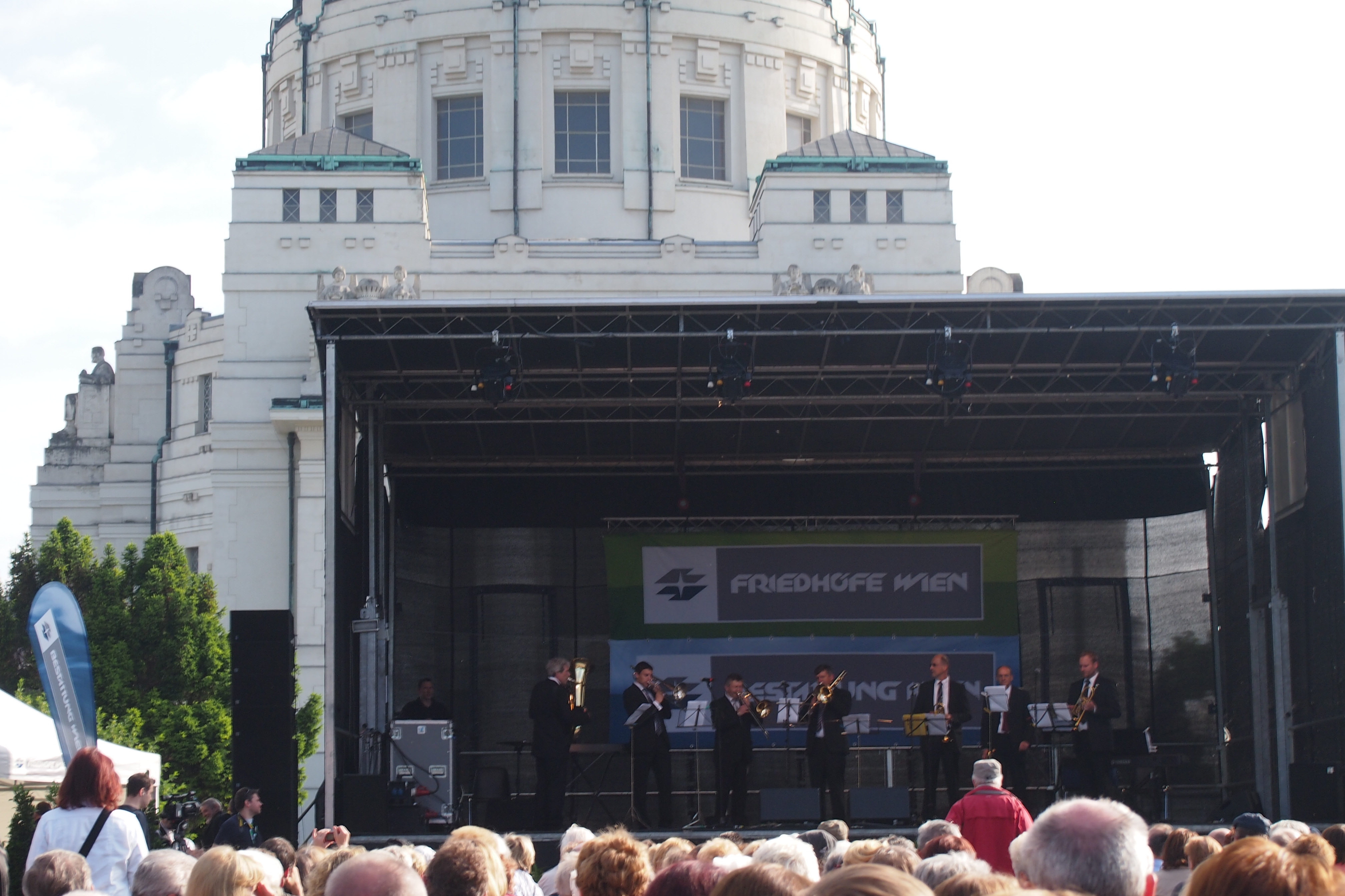 Not far from the church we noticed a rehearsal of some sort happening so we sat and listened for a little while. A dear lady told us (lucky I have a little German left) that there was a free concert starting at 5 going till 7, it was 4 so we rushed off to find the composers. Using the map proved to be very unhelpful, we looked for ages and found lots of interesting headstones but not the composers. Then we decided to use our intuition and go back to where we had seen a group of tourists with a guide. Yes! That was where the composers were, the map had given the wrong section number. That achieved we were back at the concert by 5 and settled into our seats. Now, seriously, opera, Queen and New Orleans jazz in the cemetery – who would have thought! Set up in front of the massive church and right next to the graves of Strauss, Brahms Beethoven etc. What a treat! Coming across this made up for missing the one at Schonbrunn! Great things just kept happening on that trip. Next time I think I’ll do the tour, the cemetery is so big and there is so much history buried there that it is impossible to do it all alone.
