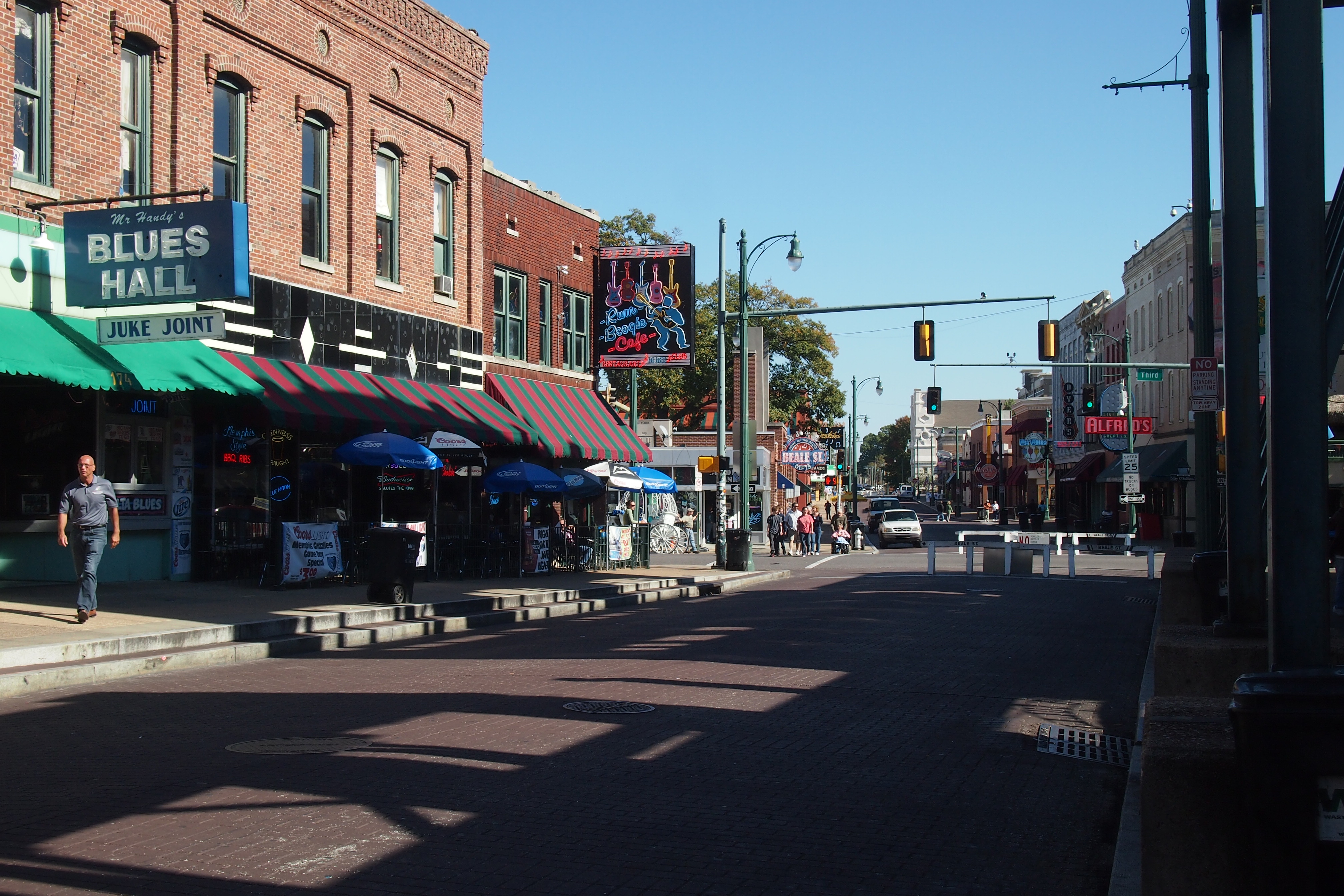 Today was our last breakfast in Branson accompanied by Georgina and her lovely country voice. Then a couple of hundred miles later, mostly travelling through stunning tapestries of Autumn colour, we arrived at the Heartbreak Hotel Memphis! Can’t believe it! I am in Memphis and tomorrow we will be doing the Graceland etc tours – yee haa! Had dinner at the Blues City Cafe (cat fish and ribs) and discovered the local brew -really nice dark sparkling lager. A brief walk down Beale street and now for a rest, poor Alice must be exhausted seeing as she is doing all the driving. Ooh, so much to do tomorrow!