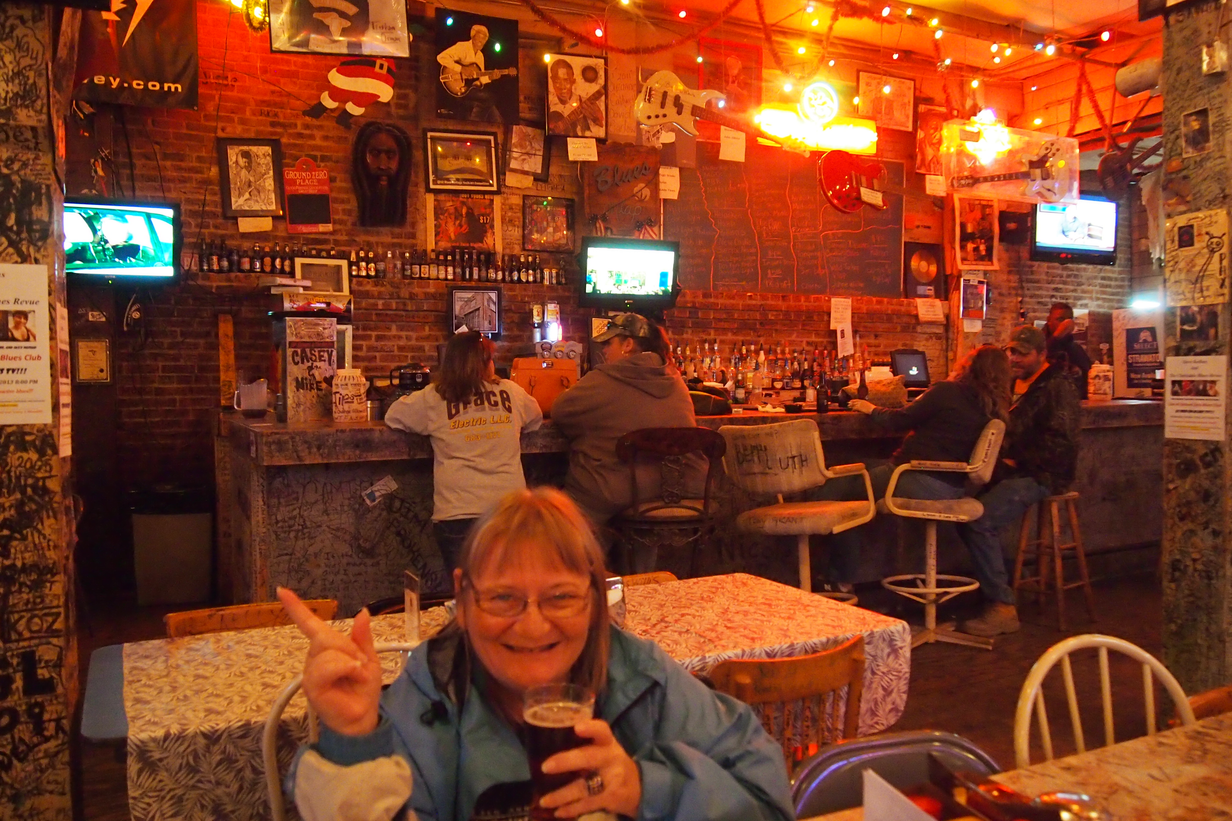 And the beat goes on! and on! So, here we are in the land of John Lee Hooker, Robert Johnston, Muddy Waters, Howlin’ Wolf etc etc….. Yes it’s Clarksdale Mississippi. It’s a far cry from it’s hey day in the 20’s when it was booming and full of millionaires, it’s sadly struggle town now, but the music continues and the Delta blues are alive and well. It’s Hambone festival this weekend so we’ll go listen tomorrow as most of the shops and clubs will be closed (it being Sunday and all). We checked out a few arty shops, went to the Delta Blues Museum, had lunch at the Yazoo Place (finally a place that has real espresso AND proper burgers). Dinner at the Ground Zero Blues Club co-owned by THE Morgan Freeman. Cool place, food is basic, decor is indescribable (take a look at the photos!) it wasn’t planned that way but one day someone gave someone a marker and the rest is history, every square inch of every surface is signed by a guest, the music is awesome! The band tonight (Stan Street and the Hambone Blues Band) was exceptional – pity we are still exhausted from last nights effort at the Jerry Lee Lewis cafe, so only stayed for a couple of hours tonight but what we heard was amazing. So lets see what tomorrow brings!