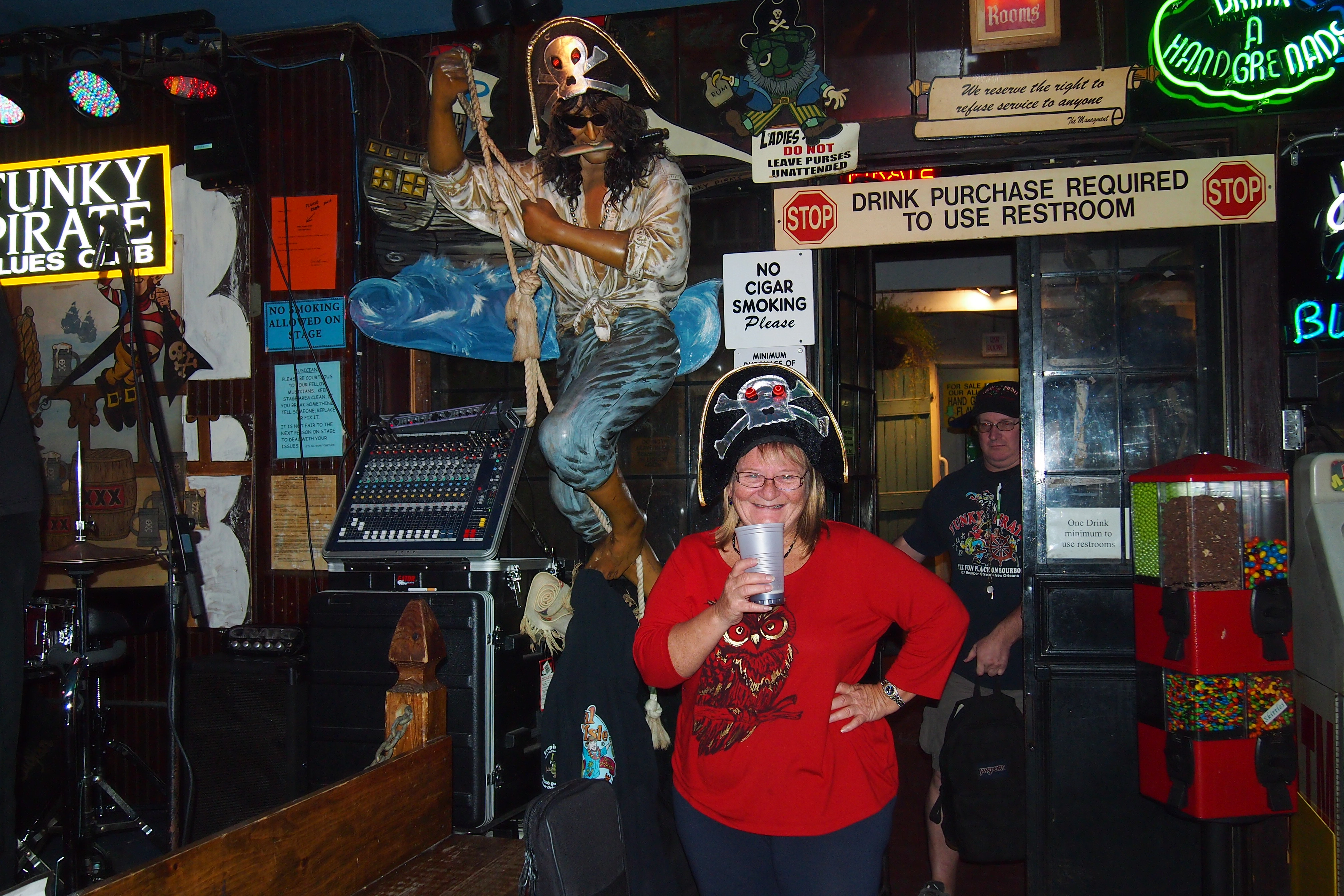 Couple of great days in New Orleans. Although the bus tour was disappointing and the hand grenades wiped me out, exploring this place has been awesome. I did get to learn about Hurricane Katrina and the devastation it caused (Queenslanders know about this) There is still about 40% of the city not liveable. The 9th ward got the worst and so many houses just left empty. There’s a long process for the people who were left homeless but they can return if they want and there is help but I guess some are just emotionally so devastated they aren’t dealing with it well or prefer to stay elsewhere, after all it has been a while. A walk around Frenchman Street uncovered all sorts of fascinating places. Night time we went to a Tropical Isles Bayou blues and were introduced to French Cajun music – rather cool. That’s where the Hand Grenades got me! But I did get a standing ovation for being from Australia! Today we went on a swamp tour, that was great cruising down the swamp and meeting wild pigs and raccoons and an ibis, no ‘gators unfortunately, it was too cold (but I did get to hold a baby alligator back in the office), loved that trip. Night time discovered the Funky Pirate bar Big Al Carson (he is really big man with a big voice) stuck around for a couple of sets and a few beers (Pirate’s blood ale) – nice night!!